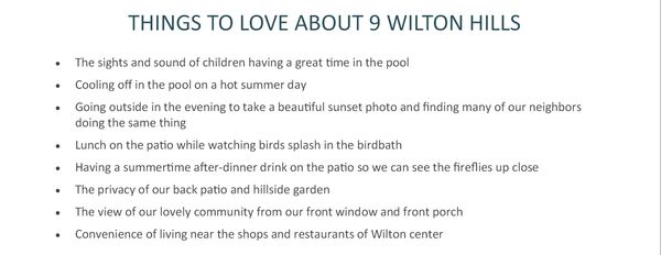Welcome to 9 Wilton Hills, perfectly located for easy access to shopping, restaurants, train station and many Wilton, Westport and Norwalk amenities. With soaring 2-story ceilings, an open floor plan and incredible natural light throughout, this immaculate home offers easy living in a wonderful community. Enter into a spacious foyer with Powder Room which leads to a den/office with built-ins and gorgeous view of the community pool. The spacious living room with wood burning fireplace is open to the dining room which features a sliding door to the private back patio. The eat-in kitchen features granite countertops, newer appliances, island with seating, abundant cabinet space and a cozy dining area overlooking private patio. The spacious primary suite is on the main level and features a vaulted ceiling and views of the private gardens. The primary bath is a spa-like retreat with whirlpool tub, glass shower, double sinks and a separate water closet. A generous walk-in closet completes the primary suite. Main level laundry room leads to the 2-car attached garage. Upstairs is a sitting area plus 2 spacious bedrooms and a full bath with tub. A huge lower level offers tremendous storage and could be finished if desired. Many upgrades including tankless water heater (2017), water softener, Moen water monitoring system, washer/dryer (2020), dishwasher (2022), exterior painted (2022), irrigation system and professional landscaping. Premier location within the Wilton Hills Community!